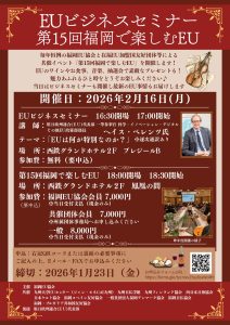 新 着 情 報 イベント【参加者募集】福岡EU主催 EUビジネスセミナーおよび「第15回福岡で楽しむEU」2025年12月17日お知らせ【EU関連イベント情報】ウィーン八重奏団2025年12月10日お知らせ【受付終了しました】福岡EU協会主催「EUのクリスマス」2025年11月4日お知らせ【EU関連イベント情報】カンタータプロジェクト20252025年9月18日お知らせ【EU関連イベント情報】ハプスブルク大公来日記念講演&ウィーンミュージカルコンサート in FUKUOKA2025年9月8日 新着情報一覧